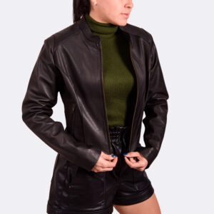 Chaqueta para dama. Construida en fina piel. De becerro. Con acabado tipo pulido. Italiano. La cual cuenta con. Costuras realizadas en forma de rombo. En los laterales. Cierre metálico al frente de la marca.KK Cuello tipo, Mao. Y en su interior tenemos un fino forro. De acetato. Grabado en líneas diagonales Y una bolsa interior
